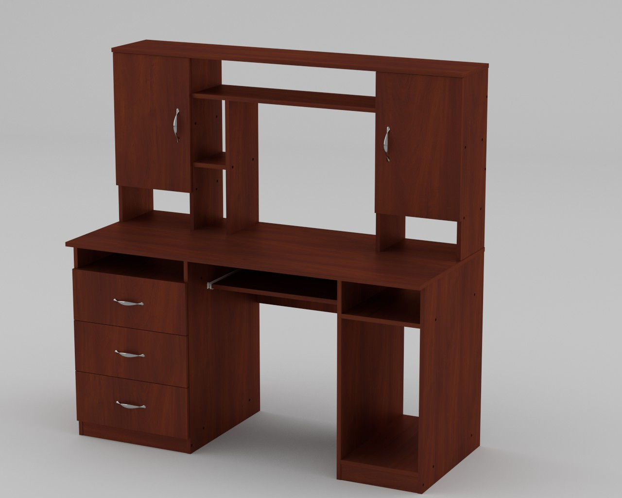 Стіл комп'ютерний Менеджер — найкращий варіант для облаштування робочого місця працівника в офісі або вашого особистого в домашньому кабінеті. Виріб вирізняється великою функціональністю, тому всі необхідні вам речі завжди будуть у вас під рукою. На стільниці великого розміру можна розмістити комп'ютер і комплектуючі в ньому, і у вас однаково залишиться багато місця для ведення письмової роботи. Над стільницею з правого та лівого боку розміщені місткі ящики, що закриваються на двостулкові дверцята, у яких можна заховати робочу документацію й багато іншого. Між ящиками є кілька відкритих ніш, де можна зберігати різні дрібниці, наприклад, канцелярське приладдя. З лівого боку столу розміщена велика тумба з трьома шухлядами, які обладнані роликовими коліщатками, завдяки чому їх зручно діставати та повертати назад. Права сторона комп'ютерного столу Менеждер відведена під велику нішу, у яку можна помістити системний блок.